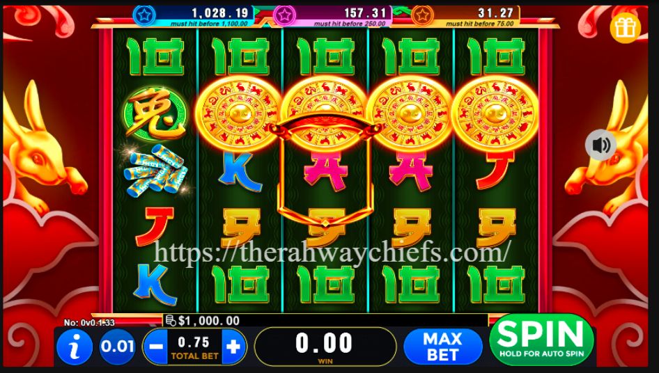 Animasi kelinci melompat, kilau emas, dan musik oriental menambah kesan menyenangkan dan hoki.